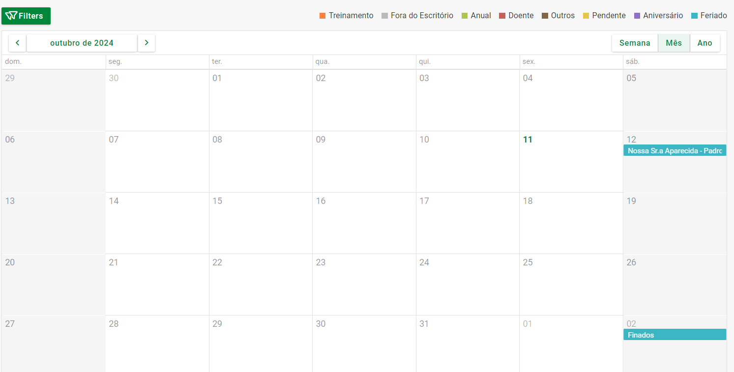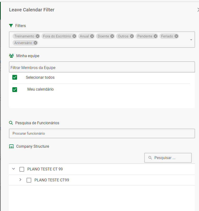 A opção "Filtros" permite que os usuários filtrem as informações que desejam visualizar no Calendário de Licenças. Os filtros podem ser aplicados com base em ausência temporária, treinamento, tipos de licença, aniversários, feriados, empresa (aplica-se a empresas de um grupo) ou unidades organizacionais.