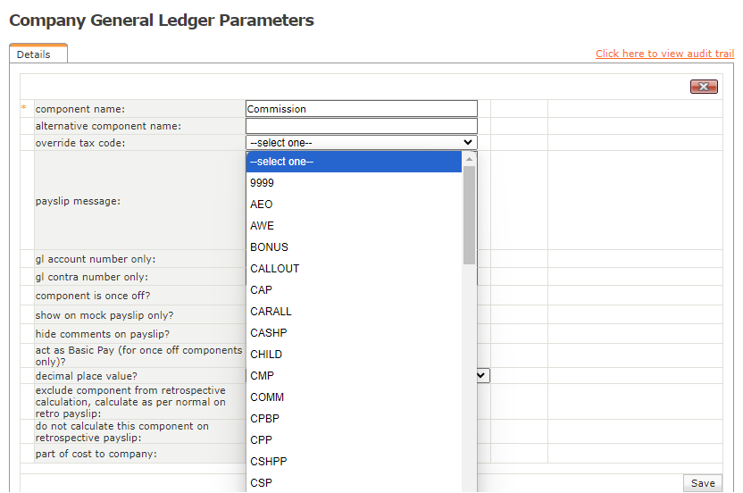 Depois que um componente é criado, seu código de imposto pode ser substituído conforme necessário na tela Parâmetros da contabilidade.