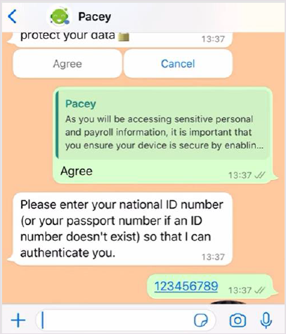 Depois de aceitar os Termos de Segurança, o funcionário será solicitado a inserir seu número de identificação nacional ou número de passaporte, se o funcionário não tiver um número de senha ou número de Seguro Social, ele precisará inserir seu número de Permissão de Trabalho para que a Pacey autentique o Usuário.