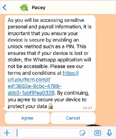 Ao iniciar uma conversa com Pacey dizendo "Oi", o funcionário será solicitado a concordar com os Termos e Condições de Segurança da Pacey.