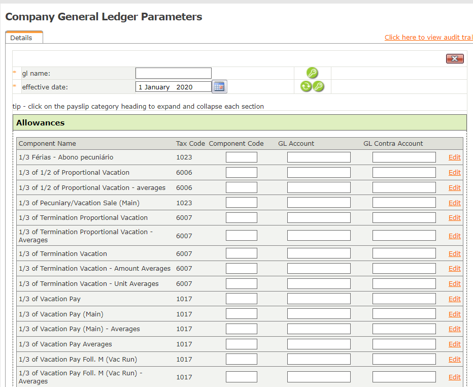 Navegue > Configuração > Folha de Pagamento > Configuração da Folha de Pagamento > Parâmetros do Razão Geral