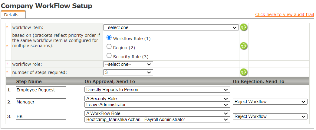 Um usuário de nível de empresa pode configurar o caminho do fluxo de trabalho com vários aprovadores/etapas na tela Configuração do fluxo de trabalho . Este é um recurso de Configuração avançada do fluxo de trabalho que será feito especificando o número de etapas necessárias no fluxo de trabalho.