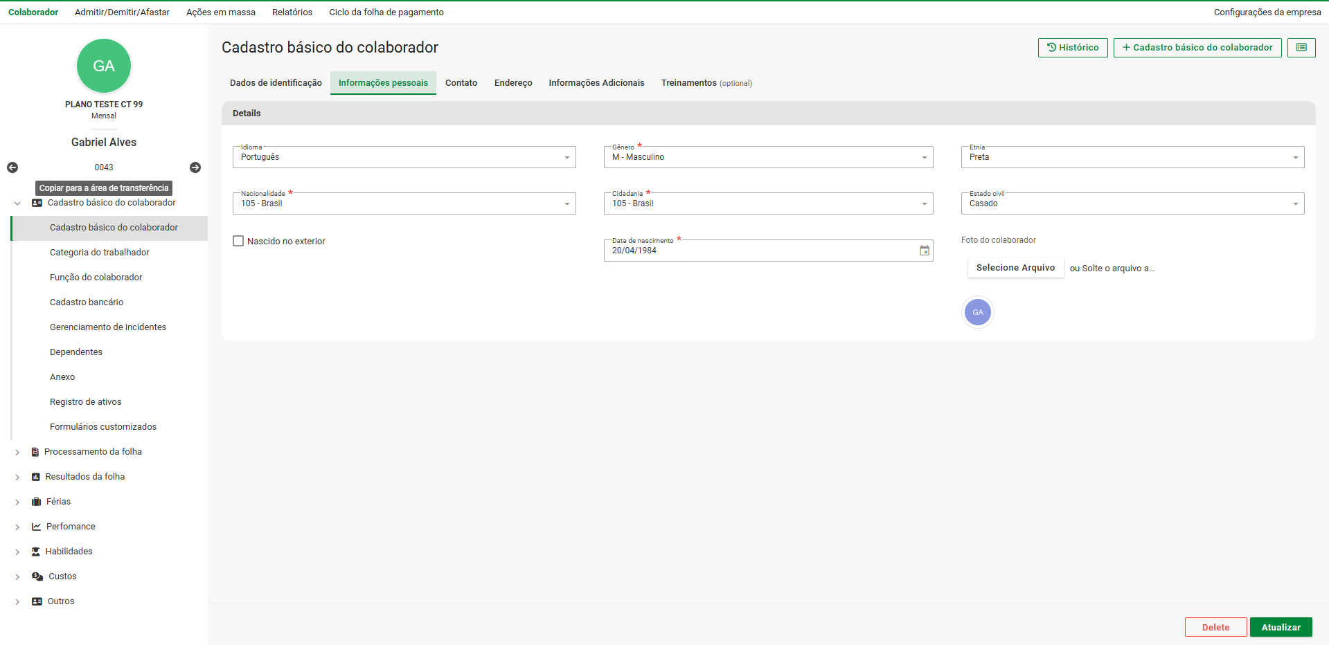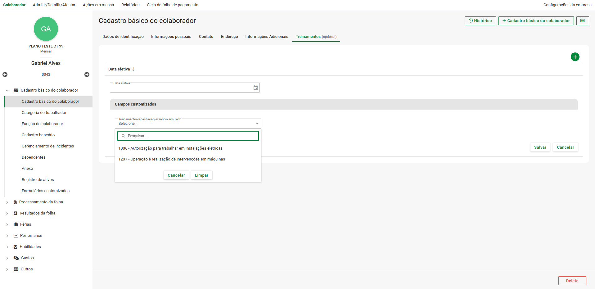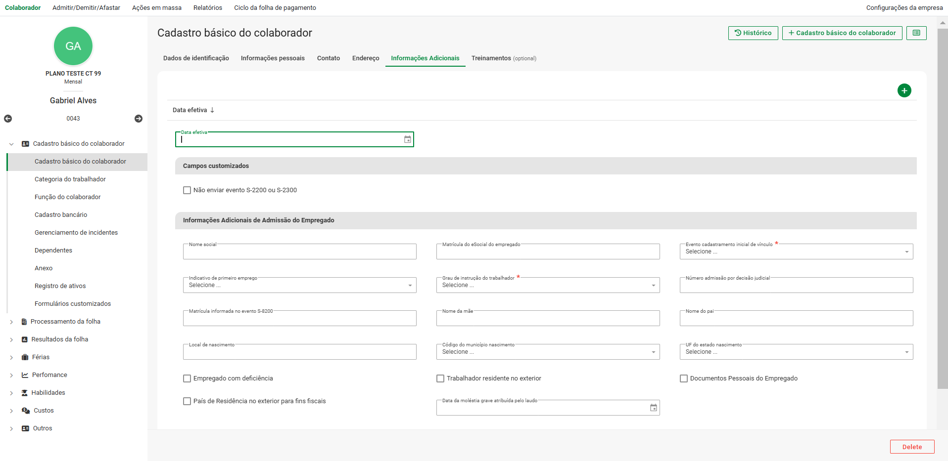 Existem vários campos a serem preenchidos na tela do Perfil Básico de um funcionário, incluindo campos estatutários ou personalizados.