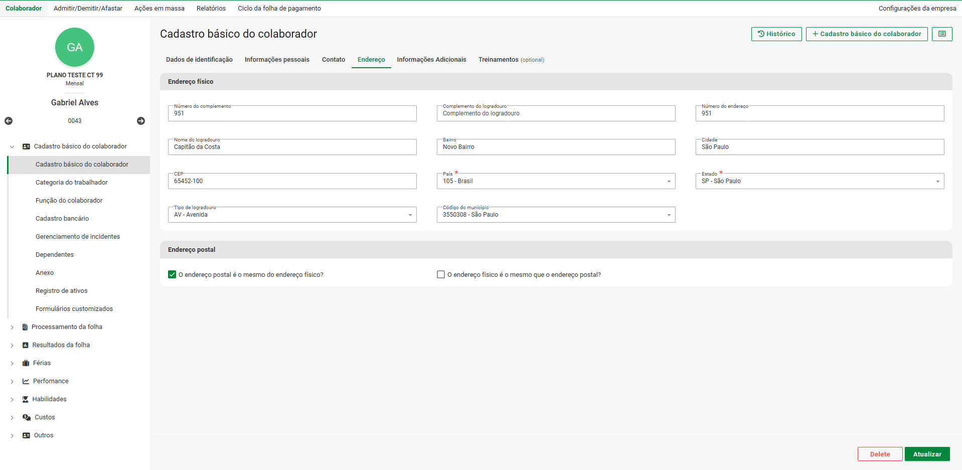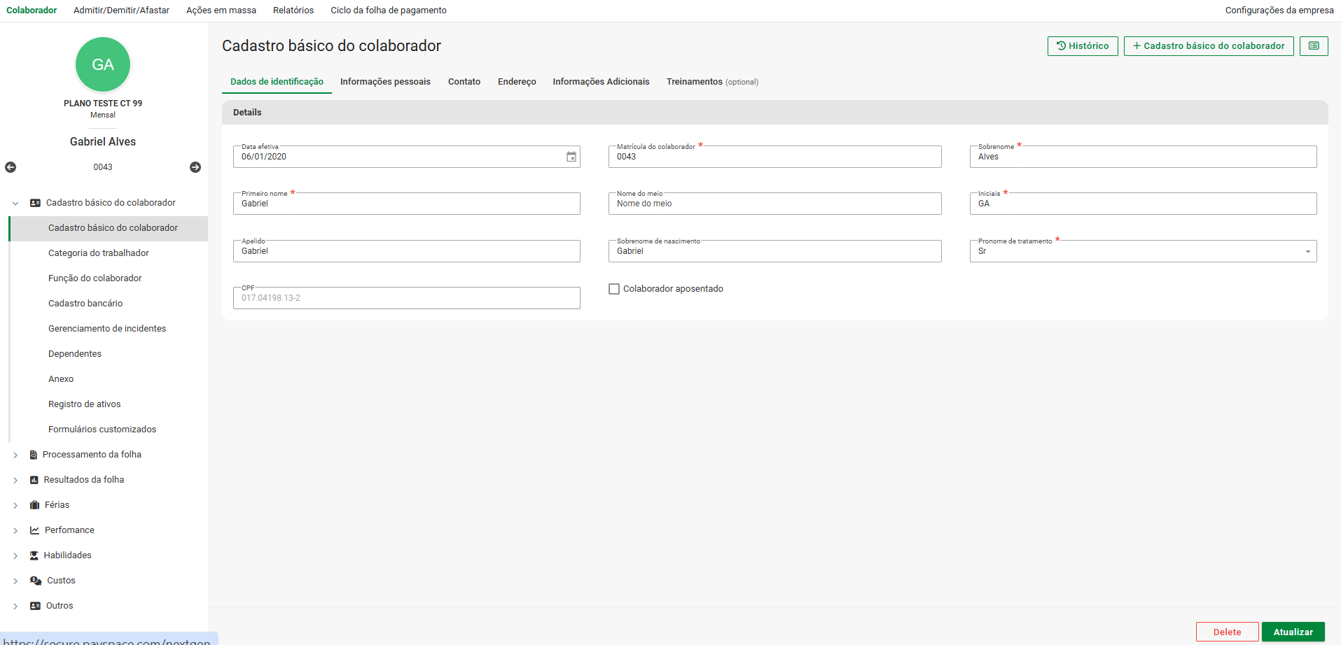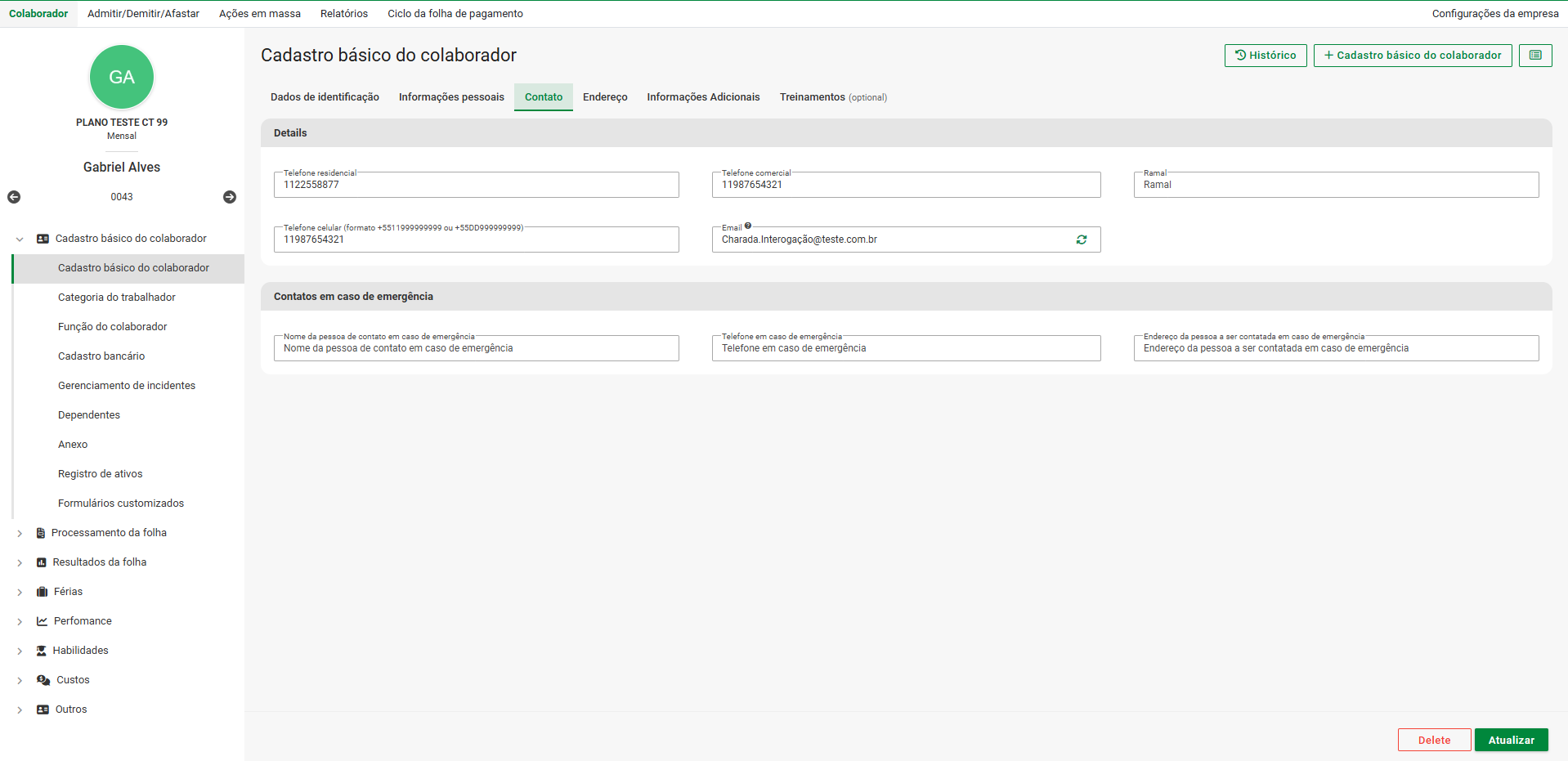 Existem vários campos a serem preenchidos na tela do Perfil Básico de um funcionário, incluindo campos estatutários ou personalizados.