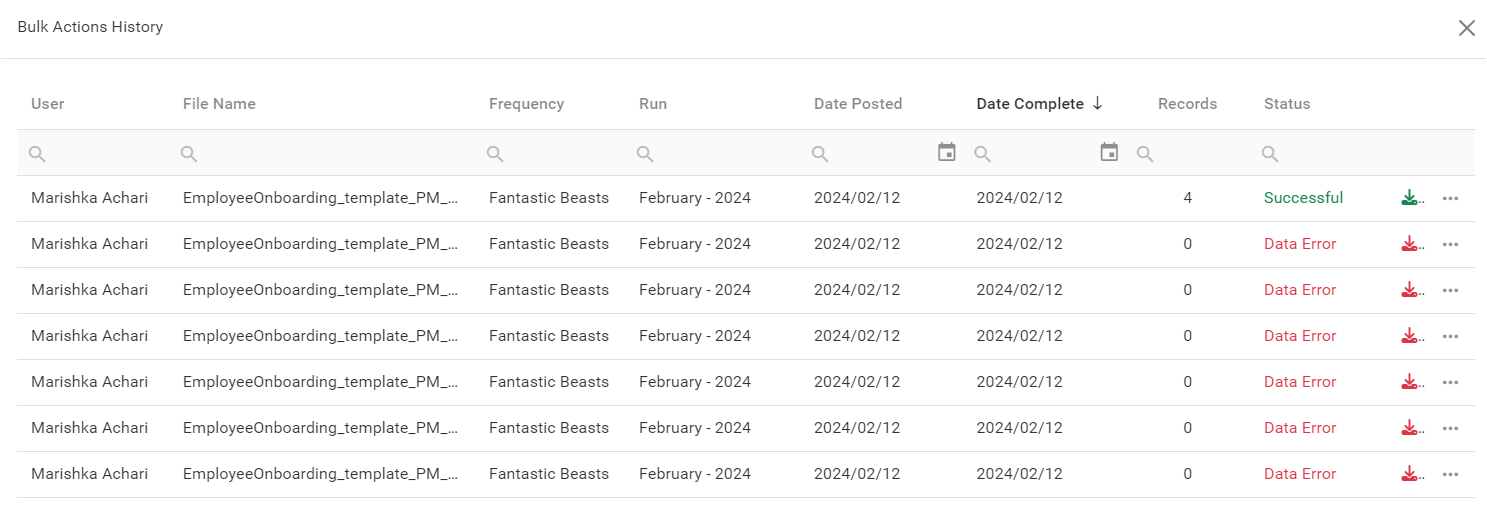 Para uploads em massa que falham com erros na planilha, navegue até o botão Histórico na tela Ações em Massa e clique no botão de download para recuperar seu arquivo. Uma coluna no final da planilha que especifica os erros por linha, tornando muito mais fácil corrigir os erros e fazer o upload novamente.