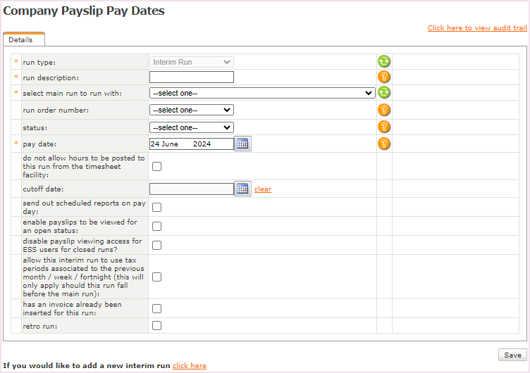 Select main run to run with | Para fins de relatórios, indique a qual Main Run o Interim Run deve ser vinculado. Ao selecionar para imprimir um relatório por mês, os números do Main Run, bem como do Interim Run, serão incluídos. Quando o Interim Run é criado dentro dos primeiros sete dias do mês, ele ainda pode ser vinculado ao Main Run do período de pagamento anterior. Após o sétimo dia, ele deve ser vinculado ao Main Run do período de pagamento atual. Isso é para evitar que você tenha que reenviar um evento e-social |