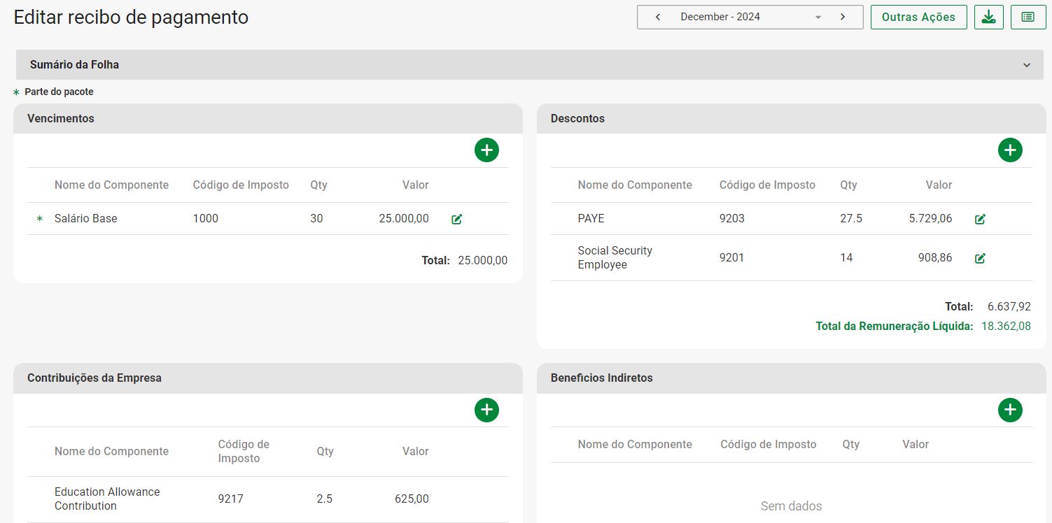 A tela de edição do recibo de pagamento