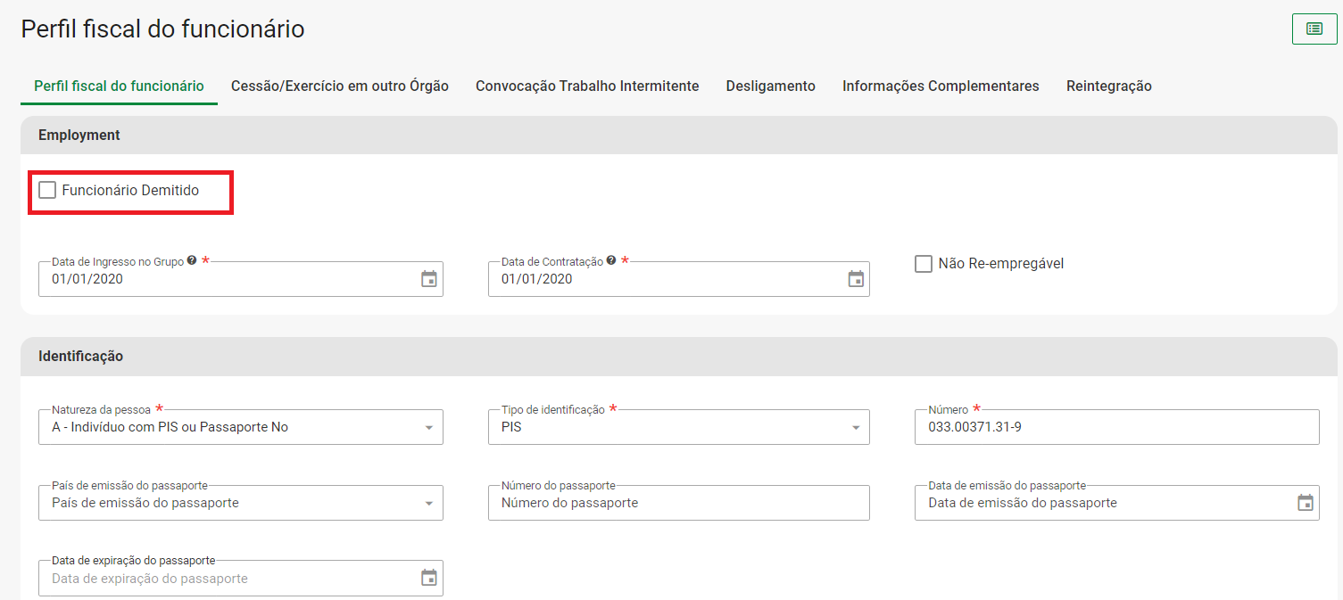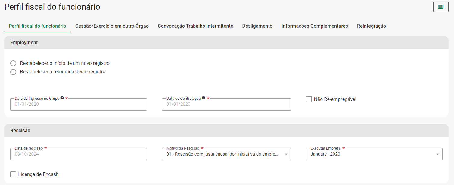 A tela de perfil fiscal após preencher os detalhes da rescisão:
