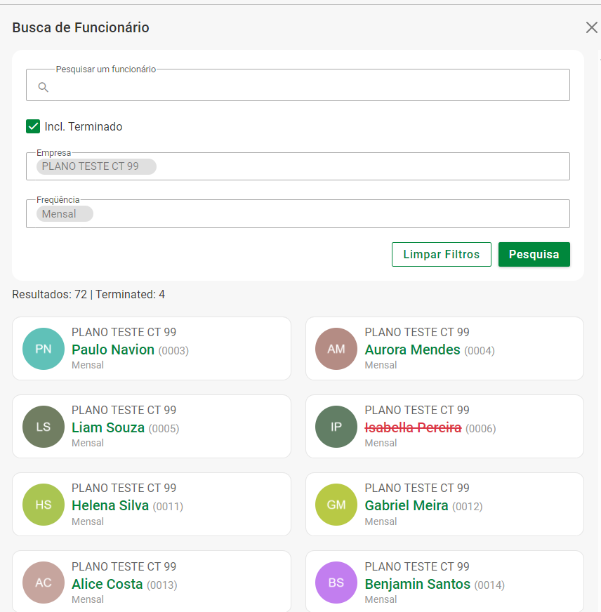 Ao procurar um funcionário demitido, lembre-se de selecionar o Incl. Caixa rescindida na tela de pesquisa do funcionário.A tela de pesquisa do funcionário: