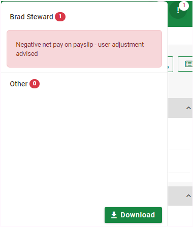 Para baixar uma planilha que lista os erros de folha por frequência, clique no ícone vermelho com um ponto de exclamação no canto superior direito da barra de título e selecione o botão "Download" na parte inferior da janela.