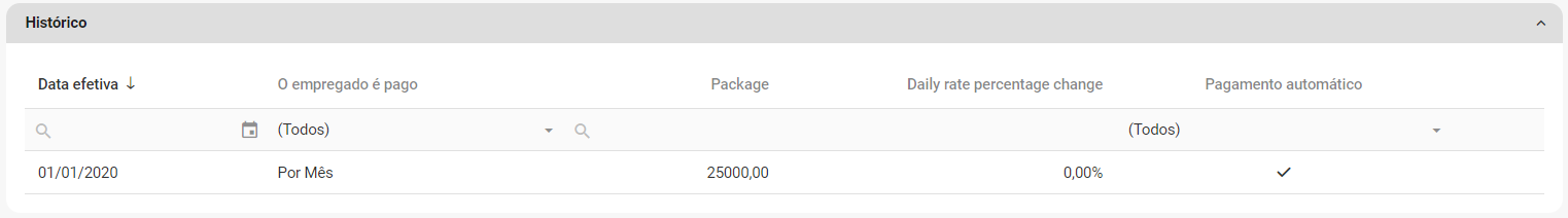 Uma lista dos registros de taxa de pagamento de um funcionário pode ser visualizada na grade de histórico na parte inferior da tela Detalhes da taxa de pagamento.