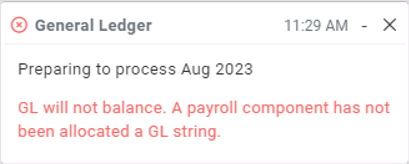 O erro "GL não será balanceado. Um componente de folha de pagamento não foi alocado em uma Cadeia de caracteres GL" é um erro geral produzido pelo sistema se qualquer componente Provisão/Dedução/Contribuição da Empresa tiver um valor de folha de pagamento, mas não tiver sido mapeado para um número de conta GL.
