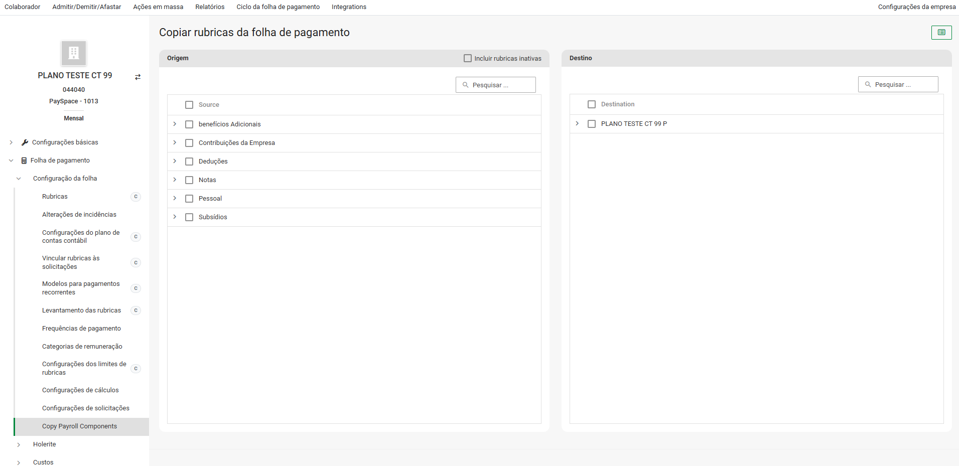Copie as configurações avançadas de rubricas de folha de pagamento, incluindo a base de renda do componente (exceto referências específicas da empresa, ou seja, configurações de licença) e as configurações conforme configuradas nas opções extras.