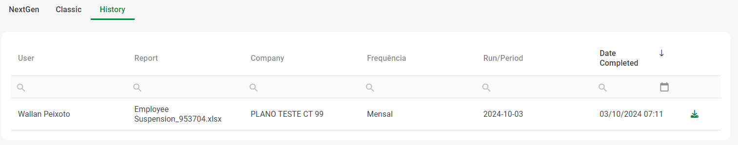 Nota: Os relatórios que refletem na guia de histórico na tela de relatórios serão os relatórios que foram extraídos pelo usuário logado no sistema.