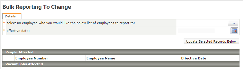 A tela Alterações de relatórios em massa permite que os usuários movam um grupo de subordinados de um subordinado diretamente para uma pessoa (ou seja, gerente) para outro quando o gerente original é demitido.