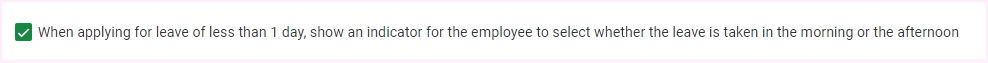 Para permitir que os funcionários especifiquem se estarão de licença no primeiro ou no segundo semestre do dia, ative a caixa de seleção "Ao solicitar licença de menos de 1 dia, mostre um indicador para o funcionário selecionar se a licença é tirada pela manhã ou à tarde" na seção Autoatendimento do funcionário na tela Configurações de licença.