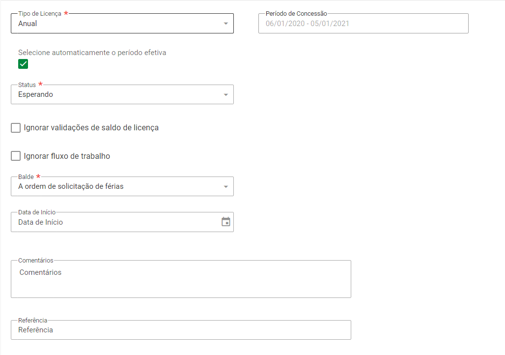 Navegar > Configuração > Recursos Humanos > Administração de Licenças > Configurações de Licença > Autoatendimento de funcionários